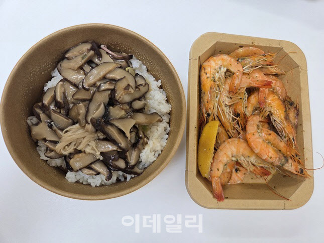 | | 3990원 균일가 구성인 유산슬 덮밥(왼쪽), 3990원 메뉴인 트로피칼 새우(오른쪽). 별도 조리 없이 바로 먹을 수 있는 형태다. (사진=한전진 기자) |