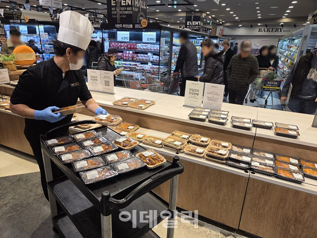 지난 토요일 오후 엔씨백화점 강서점 지하 1층, ‘델리바이애슐리’ 코너 앞에는 장바구니를 든 손님들이 옹기종기 모여 있었다. 누군가는 “이거 3990원이래, 요즘 이런 반찬이 어딨어”라며 놀랐고, 또 다른 이는 갓 포장된 폭립을 바로 장바구니에 담고 있었다. 주방에선 쉼 없이 즉석조리 메뉴가 쏟아져 나왔고, 직원은 수십 개씩 정리된 음식 트레이를 냉장 진열대에 빠르게 채워 넣느라 분주했다.