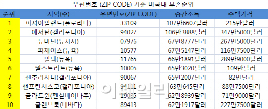 미국 경제매체 CNN머니는 미 행정구역을 나누는 기준인 우편번호(Zip Code)를 토대로 12일(현지시간)고소득자가 모인 구역을 집계했다. 그 결과 플로리다주 마이애미에 속한 휴양섬 피셔아일랜드(33109)가 1위에 올랐다.