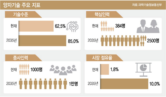 과학기술정보통신부에 따르면 우리나라는 현재 미국·중국 등 양자기술 선도국 대비 기술력과 인력에서 격차가 있지만, 2035년까지 이를 대폭 줄이는 것을 목표로 했습니다. 현재 양자과학기술 수준은 선도국 대비 62.5% 수준이지만, 2035년에는 85%까지 끌어올릴 계획입니다.