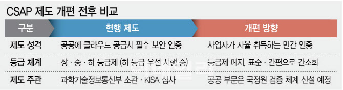 CSAP 등급제 역시 손질한다. 물리적 망분리를 전제로 설계된 CSAP는 2023년 상·중·하 등급제를 도입해 하 등급에 한해 망분리 규제를 완화한 바 있다. 당초 과기정통부는 하 등급을 우선 시행하며 상·중 등급 세부 기준을 담은 고시 개정 작업을 해오고 있었지만, 결과적으로 등급제 대신 ‘표준·간편’ 구분으로 간소화하기로 가닥을 잡았다.