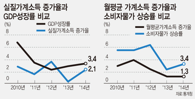 여기서 소비자물가 상승률(1.3%)을 제외하면 실질 가계소득 증가율은 2.1%에 불과하다. 작년 GDP성장률 3.4%보다 1.3%포인트 낮은 수치로 경제 성장보다 가계소득 증가율이 미미했다. 결국 가계가 지갑을 닫을 수밖에 없는 이유는 실질 소득의 상대적 감소 탓이다.