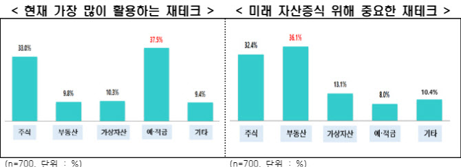 현재 가장 많이 활용하고 있는 재테크 수단은 예·적금 37.5%, 주식 33.0%, 가상자산 10.3%, 부동산 9.8%인 것으로 조사됐다.