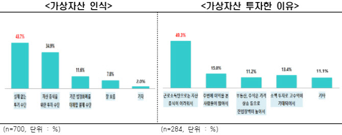 가상자산에 투자한 이유에 대해서는 ‘근로소득만으로는 자산 증식이 어려워서’라는 답변이 49.3%로 가장 많았고 이어 ‘주변에 이익을 본 사람이 많아서’(15.0%), ‘소액 투자로 고수익이 기대돼서’(13.4%), ‘부동산 가격 상승 등으로 진입장벽이 높아서’(11.2%) 등의 순이었다.