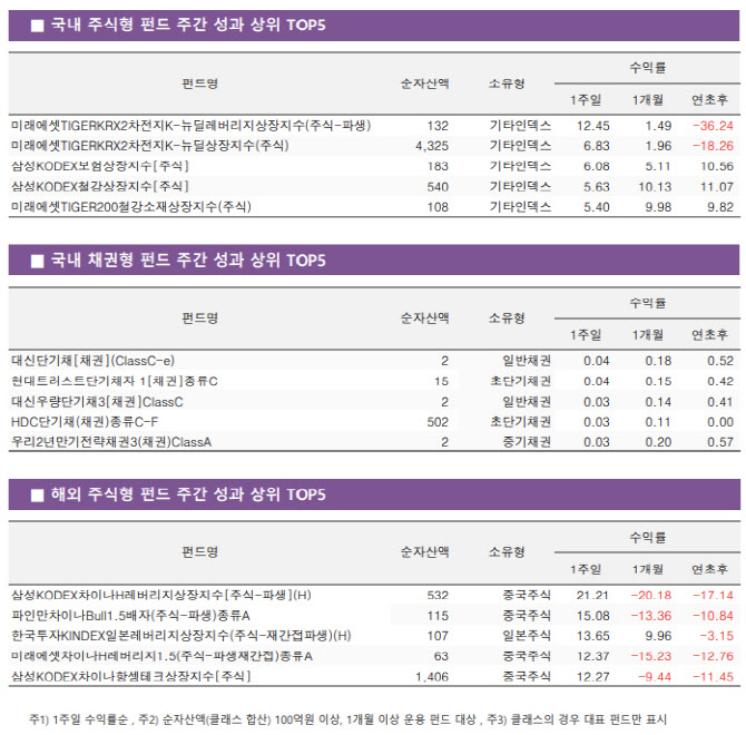 해외 주식형 펀드 평균 주간 수익률은 3.42%를 기록했다. 국가별로는 남미신흥국이 8.47%로 가장 많이 상승했다. 섹터별 펀드에선 기초소재가 6.46%로 가장 많이 상승했다. 개별 상품 중에서는 ‘삼성KODEX차이나H레버리지상장지수[주식-파생](H)’이 21.21%의 수익률로 가장 우수한 성적을 나타냈다.