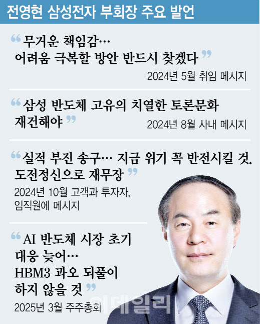 전 부회장은 취임 이후 메모리 반도체부터 다잡는 개혁 작업을 진행했다. 개발 인력과 자원을 메모리에 집중하고, 10나노급 5세대 D램(D1b) 설계 구조부터 다시 돌아보는 등 수율을 끌어 올리기 위한 노력을 병행했다. 업계 관계자는 “D램 수율에서 어려움을 겪었는데, 공정 관리에서 느슨해진 부분을 다잡고 구조를 개선하며 수율이 굉장히 개선됐다”고 했다.