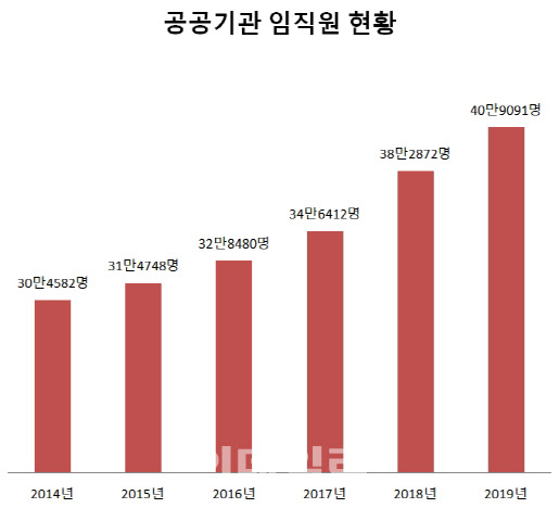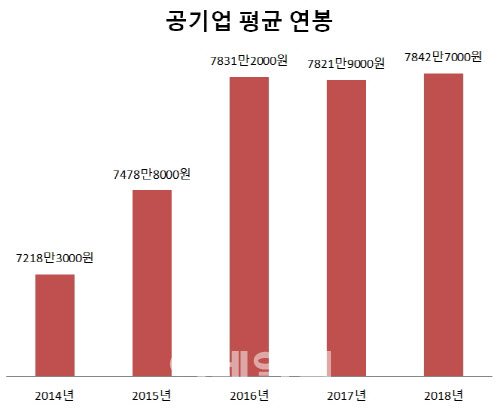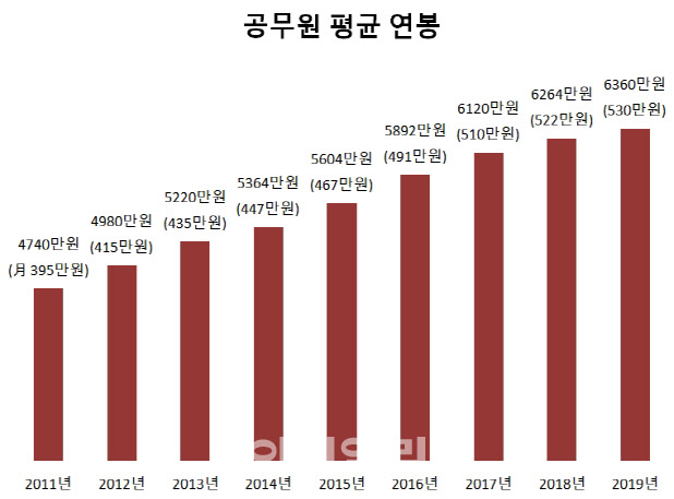인사혁신처에 따르면 지난해 공무원 평균 월급(기준소득월액 평균액)은 530만원, 연평균 6360만원(세전 소득)이었다. 월급은 2011년 첫 발표 이후 매년 늘었다. 올해 공무원 총 인건비는 39조원이다. 공기업 직원 평균 연봉은 7842만7000원(2018년 12월말 기준)이다.