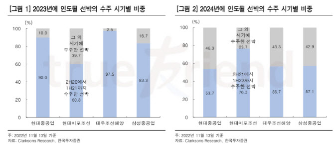 강경태 연구원은 “정상화 기로에 들어선 국내 조선사를 매수할 때”라면서 “실적과 일감 걱정에서 독립해 조선 업종에 생겨난 괴리를 좁히는 때가 2023년이며, 매수 적기”라고 말했다.