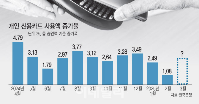 한은에 따르면 올해 들어 전년동기대비 개인 신용카드사용액 증가폭은 1월 2.5%, 2월 1.1%다. 지난해 1월 6.9%, 2월 5.3%와 비교하면 크게 쪼그라든 수치로, 비상계엄 사태가 터진 지난해 12월(3.5%)에 비해서도 줄었다. 올해 1~2월을 합해서 봐도 개인 신용카드 사용액 증가 폭은 1.8%로 지난해 같은 기간(6.1%)의 3분의 1도 안 된다.