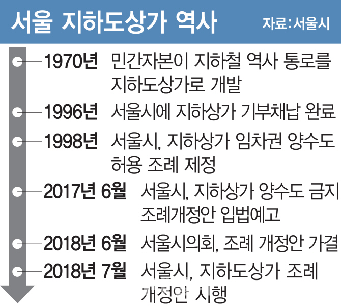 지난 1996년에는 민간 개발업체가 지하상가를 모두 반환하자 서울시는 2년 뒤인 1998년 임차권 양수·양도(상인끼리 임차권을 사고 파는 것)를 허용하는 내용의 지하상가 관리 조례를 제정·시행했다. 이후 20여년간 지하도상가에서는 계약 기간이 끝나지 않은 상가들의 전대(재임대)가 가능했다. 이 과정에서 불법이지만 권리금도 오갔고, 서울시도 이를 사실상 인정했다.