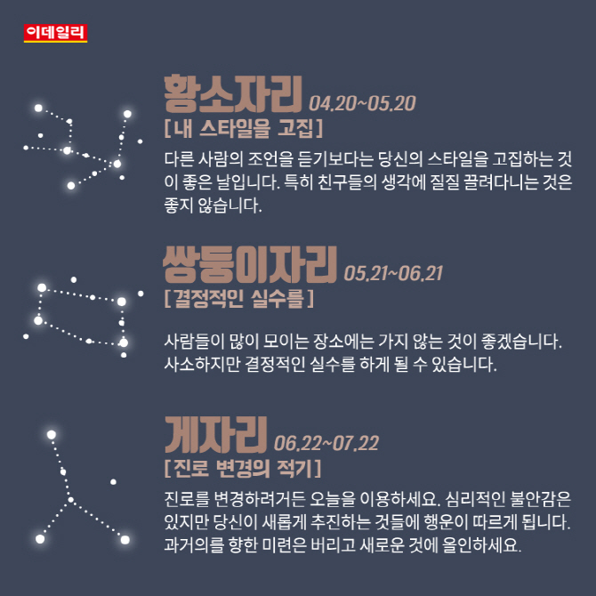 △황소자리 : 다른 사람의 조언을 듣기보다는 당신의 스타일을 고집하는 것이 좋은 날입니다. 특히 친구들의 생각에 질질 끌려다니는 것은 좋지 않습니다. 조언이 필요하다면 나이 차이가 있는 사람에게서 의견을 구하세요.