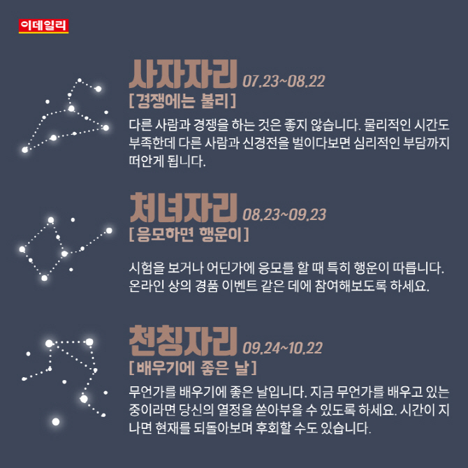 △사자자리 : 다른 사람과 경쟁을 하는 것은 좋지 않습니다. 물리적인 시간도 부족한데 다른 사람과 신경전을 벌이다보면 심리적인 부담까지 떠안게 됩니다. 되도록 타협을 하고 협조를 하면서 지내는 것이 좋습니다.