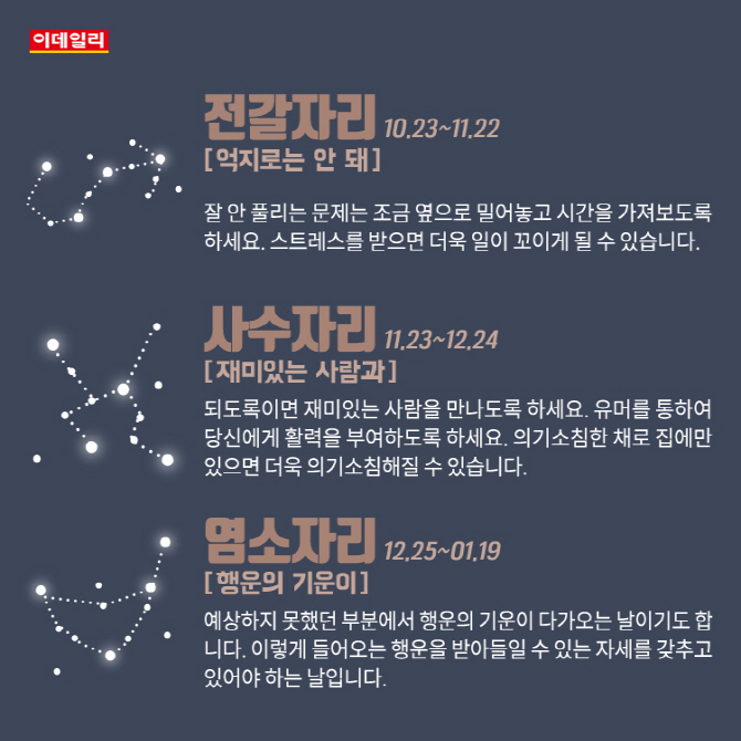 △전갈자리 : 억지로 문제를 해결하려고 애쓰면 더더욱 피곤해질 수 있습니다. 잘 안 풀리는 문제는 조금 옆으로 밀어놓고 시간을 가져보도록 하세요. 스트레스를 받게 되면 더욱 일이 꼬이게 될 수 있습니다.