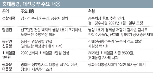 문 대통령이 대선공약을 수정한 사례가 없는 것도 아니다. 2020년까지 최저임금 1만원을 달성하겠다는 공약은 자영업자·소상공인 등의 부담과 현실성 등을 고려해 파기됐다. 문 대통령은 지난해 이 같은 사실이 확정되자 “대통령으로서 대국민 약속을 지키지 못하게 된 것을 매우 안타깝고 송구스럽게 생각한다”고 고개를 숙였다.