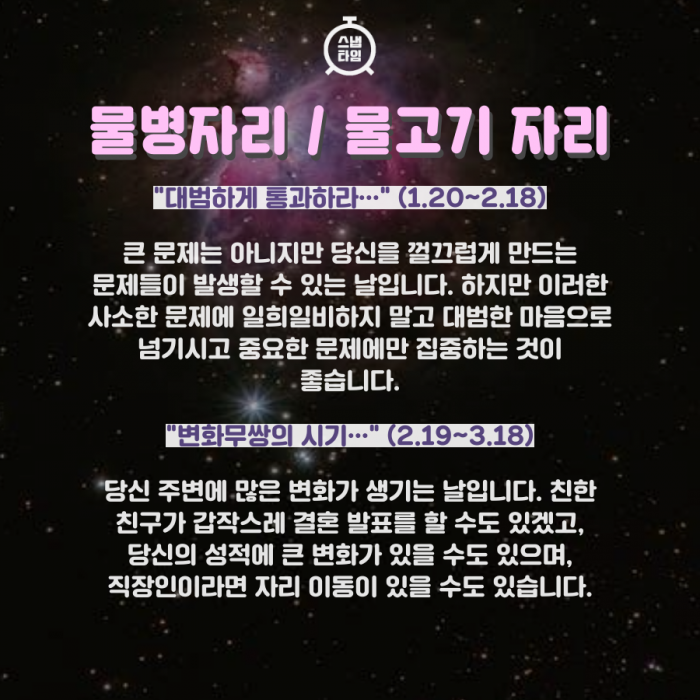 커플인 분이라면 상대방이 조금 시들해진 것 같다고 하여 발끈하지 마세요. 반응이 전혀 없는 것처럼 보이지만 실제로는 두 사람 사이에 믿음의 줄이 튼튼하게 작용을 하니까요. 싱글인 분이라면 주변에 이성이 많이 나타나는 날입니다.