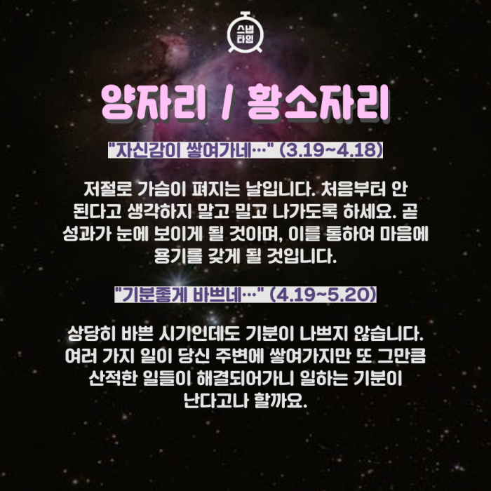 상당히 바쁜 시기인데도 기분이 나쁘지 않습니다. 여러 가지 일이 당신 주변에 쌓여가지만 또 그만큼 산적한 일들이 해결되어가니 일하는 기분이 난다고나 할까요.