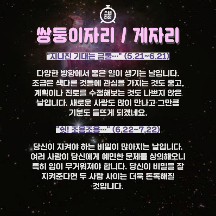 싱글인 분이라면 오늘 만나는 사람에 대해서는 어느 정도 의심의 눈길을 보내실 필요가 있습니다. 겉으로 보여지는 상대방의 모습이 아니라 그 뒤에 있는 진짜 모습을 살펴볼 수 있도록 하세요.