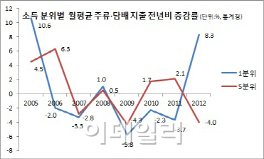 그러나 소득 분위별로 보면 상대적으로 생활고에 더 많이 시달리는 저소득층의 담배와 술에 대한 지출은 큰 폭으로 늘어났다. 하위 20%인 1분위의 경우 주류(6800원)와 담배(1만3700원)에 한 달 평균 쓴 돈은 2만500원으로 8.3% 급증했다. 지난 2005년(10.6%) 이후 7년 만에 최대 폭으로 늘어난 것으로 이들의 전체 소비지출 증가률(2.9%)과 비교해봐도 3배 가량 웃도는 수준이다. 전반적으로 허리띠를 졸라매면서도 담배와 술에 대한 지출만큼은 줄이지 않은 셈이다.