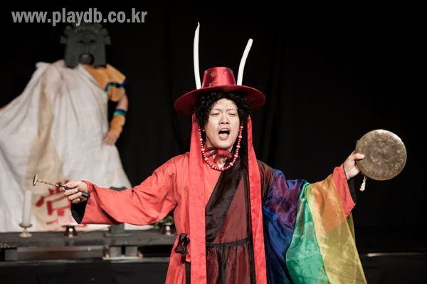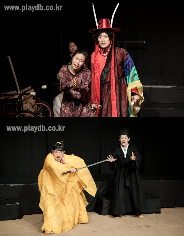 이날 뽀글뽀글한 파마머리 가발에 선글라스를 쓴 젊은 남자 무당 영덕 역의 박희순과 노란 한복을 입은 백제 의자왕 역을 맡은 손병호가 연습에 참여하고 있었다. 영덕을 데려와 굿을 청하는 장면과, 한창 굿판이 벌어지던 중 나이 든 무당의 수양딸 순단이에게 의자왕을 찌른 금화의 혼이 내리는 장면이 한창 진행중이다. 반복적인 연습이 계속됨에도 불구하고 박희순과 손병호는 힘든 내색없이 오히려 싱글벙글이다.