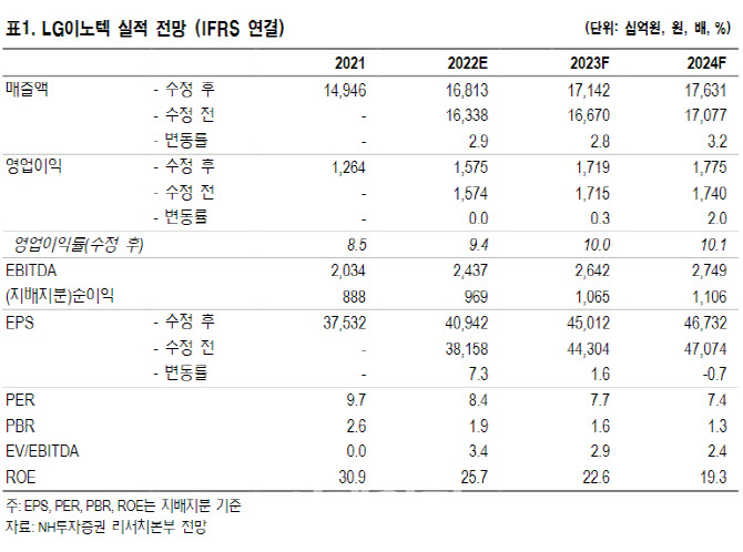 이규하 NH투자증권 연구원은 이날 보고서에서 “북미 스마트폰 업체가 2022년 역대 최다 판매를 기록할 것으로 예상되는 가운데 LG이노텍은 경쟁사 신뢰도 하락으로 점유율 확대 추세가 이어져 올해 역대 최대 실적을 달성할 전망”이라고 강조했다.