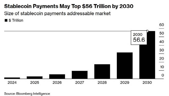 최근 그는 급성장 중인 스테이블코인 시장을 주목하고 있다. 크립토 데이터분석 기업인 아르테미스 애널리틱스에 따르면 지난해 전 세계 스테이블코인 거래 규모는 전년 대비 72% 증가한 33조달러(이하 26일 기준 4경7520조원)에 달했다. 블룸버그 인텔리전스는 전 세계 스테이블코인 결제 규모가 2030년까지 56조달러(8경640조원)에 이를 것으로 전망했다.