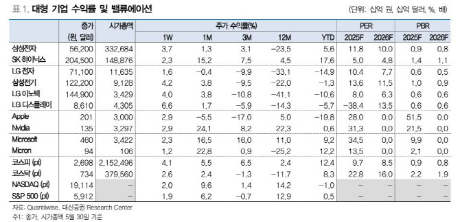 중국 수출 규제 관련한 매출의 미반영과 비용인 45억달러를 반영한 점을 고려하면 컨센서스를 큰 폭으로 상회 평가다. 중국향 수출 규제에도 불구하고 블랙웰 공급 개시로 믹스 효과가 나타나면서 매출 총이익률이 개선됐다. AI 관련한 수요가 견조함을 다시한번 확인한 셈이다. 이에 따라 박 연구원은 “반도체 중심의 비중확대 전략은 6월에도 유지한다”고 전했다.