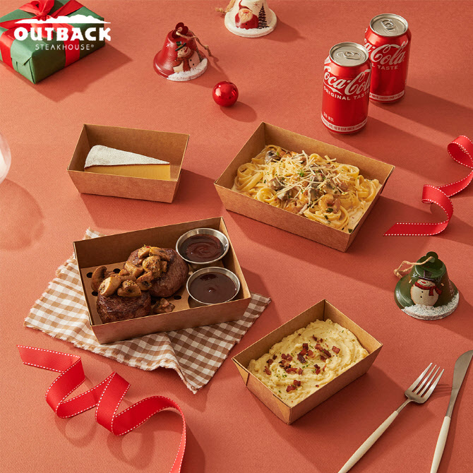 더블머쉬룸스테이크는 스파이시 레몬 갈릭오일로 조리한 양송이를 올린 스테이크로 딜리버리 전용 메뉴다. 딜리버리 스테이크 메뉴 중 유일하게 두 덩어리로 구성될 만큼 양이 풍족하고 사이드로 메쉬 포테이토도 함께 제공되기 때문에 더욱 풍성하게 즐길 수 있다. 크리스마스 파티세트에는 아웃백의 스테디셀러 메뉴인 투움바 파스타도 포함되어 아웃백의 팬이라면 더욱 반가워할 구성이다.