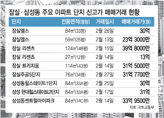 인근 삼성동에서도 신고가 행진이 이어졌다. 삼성동힐스테이트 1단지는 지난달 25일 전용 84㎡(33평형) 7층이 30억원에 거래되면서 신고가 기록을 다시 썼다. 인근 현대힐스테이트 2단지 전용 84㎡(33평형) 14층 역시 31억원에 신고가 거래되기도 했다. 또 34평형인 삼성동센트럴아이파크 전용 84㎡ 14층은 지난달 14일 평당 1억원에 조금 못 미치는 33억 9500만원에 매매 거래되기도 했다.