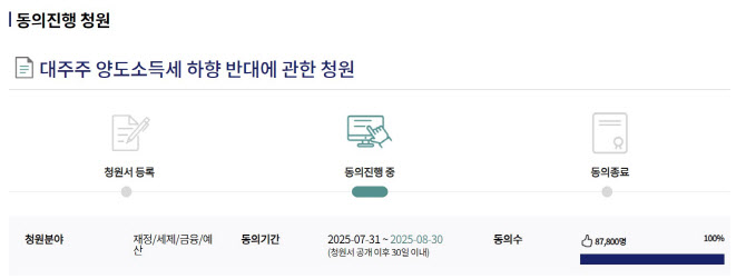 청원인은 “연말마다 회피 물량이 쏟아지면 코스피는 미국처럼 우상향할 수 없다”며 “다시 예전처럼 박스피, 테마만 남는 시장으로 전락할 것”이라고 우려했다. 그러면서 “양도세 기준을 10억원으로 설정했다고 치더라도 대부분 7억원, 8억원부터 미리 팔아버린다”며 “손익 통산도 안 되고 금융투자소득세(금투세)보다도 더 억울한 법안”이라고 꼬집었다.