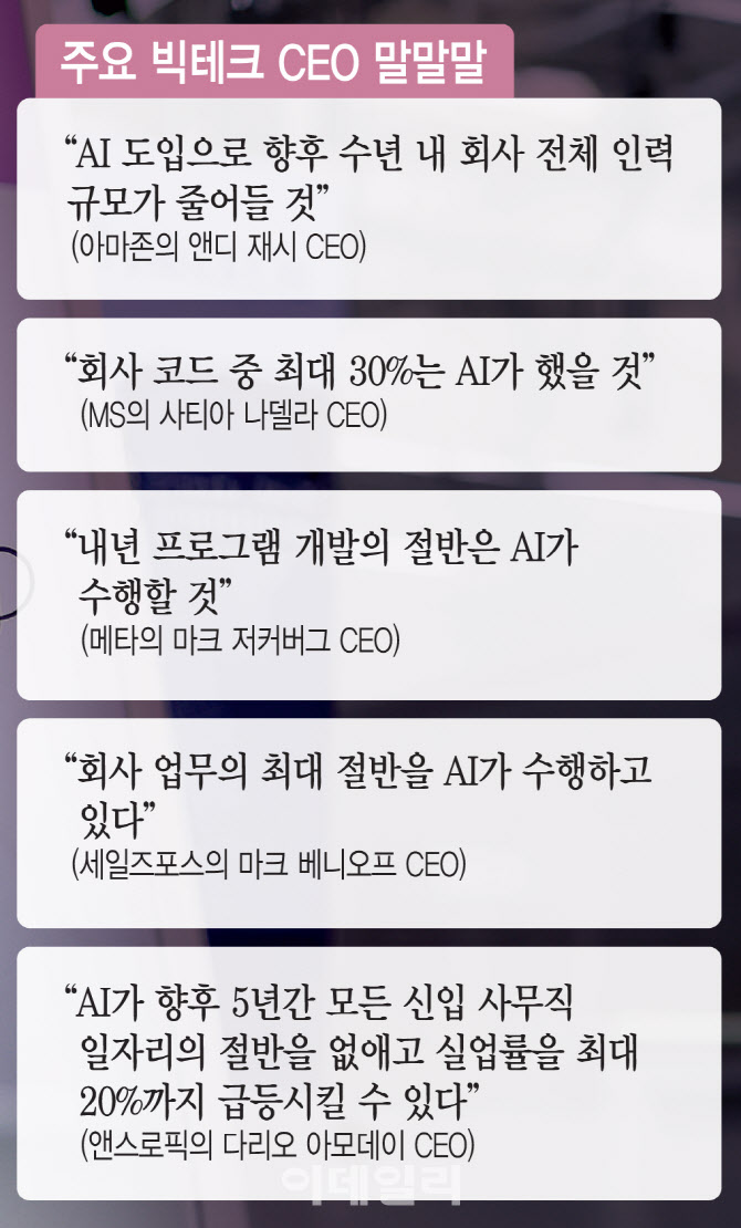 동시에 최근 글로벌 기술기업 리더들은 ‘AI로 인한 노동력 대체’ 발언을 쏟아내고 있다. 아마존의 앤디 재시 CEO 역시 최근 직원들에게 보낸 메모에서 AI는 “일생일대 기술적 변화”라며 AI 도입으로 향후 수년 내 회사 전체 인력 규모가 줄어들 것으로 예상된다고 말했다.