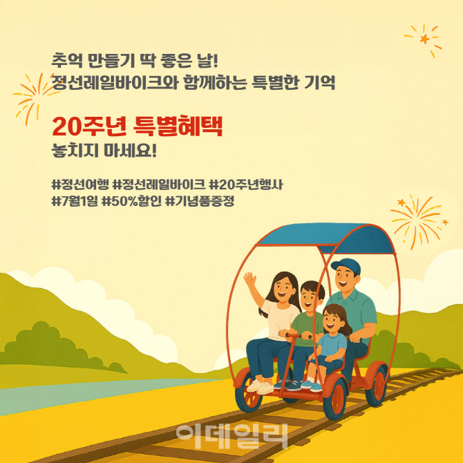[이데일리 이민하 기자] 강원도 정선을 대표하는 관광 명소인 정선레일바이크가 내달 1일 개장 20주년을 기념하여 할인 이벤트를 열고, 함께하는 고객들에게 감사의 마음을 전한다.