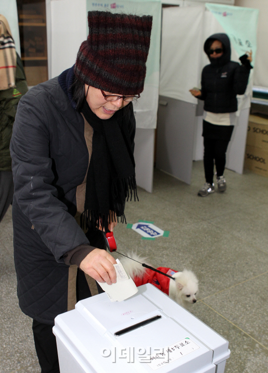 [이데일리 김정욱 기자] 제18대 대통령선거날인 19일 서울 여의도중학교에 마련된 여의도동 제4,5투표소에서 강아지를 데려온 한 유권자가 투표를 하고 있다.