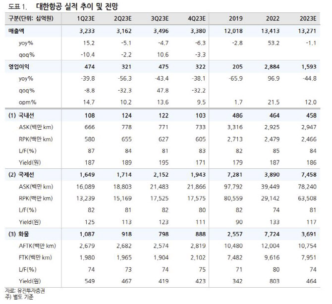 그러면서 양 연구원은 “국제 여객 매출액은 1조6485억원 전분기 대비 1063억원 상승할 것으로 예상하는데 아직 국제 여객 실적 회복이 화물 실적 감소세를 상쇄하기에는 역부족인 모습이나 2분기에 유럽 노선 복항 및 미주 노선 운항 횟수 확대를 통해 국제 여객 공급은 2019년 대비 약 80% 수준까지 회복할 것이다”라고 덧붙였다.