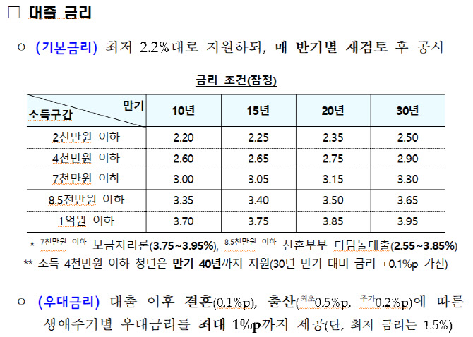 이와는 별도로 기금대출을 활용하면 생애최초 구입, 전자 계약, 노부모 부양 등 약 10여종의 다양한 우대금리 혜택을 적용받는데 우대금리에 0.5%포인트 상한을 두기로 했다. 기존에는 상한이 없어서 10여종의 우대금리를 한꺼번에 적용받을 수 있었다. 우대금리 적용 기한도 기금대출별 4~5년까지로 한정키로 했다.