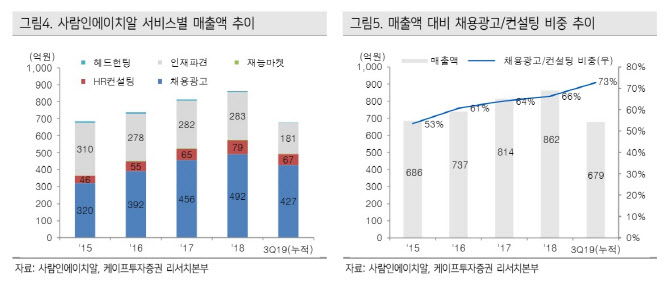 또한 사람인에이치알이 서비스 범위를 확대함에 따라 종합 HR 컨설팅 기업으로 나아갈 수 있다고 분석했다. 사람인에이치알은 지난 2018년과 2019년 두 차례에 걸쳐 채용광고 가격을 인상했으며, 추가적인 가격 인상이 진행될 여지도 있다. 김 연구원은 “가격인상은 서비스 범위 확대에서 기인한 것으로 현재도 서비스 범위가 늘어나고 있다”고 짚었다.