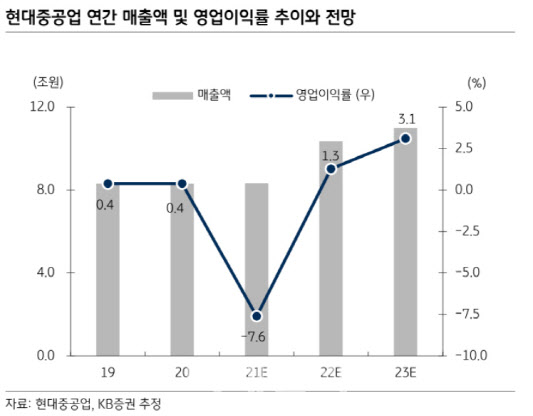 올해 실적 턴어라운드가 기대된다. 정 연구원은 “과거 저가수주 후유증에 후판 등 원자재 가격 급등과 통상임금 소송 패소까지 겹치면서 현대중공업의 2021년 영업이익은 적자 6349억원을 기록할 전망이다. 하지만 건조선가 상승과 후판가격에 대한 공사손실충당금 설정 효과 등으로 올해와 내년 영업이익은 각각 흑자 1327억원, 3424억원으로 개선될 것”이라고 전망했다.