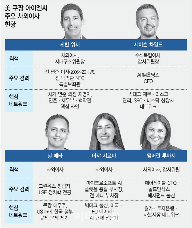 쿠팡 이사회 명단을 살펴보면 쿠팡 이사회는 사실상 미국 금융·기술·정책 네트워크의 집합소다. 창업자 김범석 의장은 의결권 74.3%로 한국 법인을 실질 지배하지만 2021년 한국 법인 이사회 의장직에서 물러나 국내 대기업 오너 수준의 법적 책임에서 비켜나 있다. 닐 메타 이사는 초기 투자사 그린옥스 창립자로, 한국 정부의 쿠팡 규제를 미 무역대표부(USTR)에 문제 제기한 인물로 알려졌다. ARM홀딩스 최고재무책임자(CFO)인 제이슨 차일드 수석독립이사는 사외이사 겸 감사위원장을 맡아 쿠팡의 정보보안·개인정보보호 정책을 감독한다.