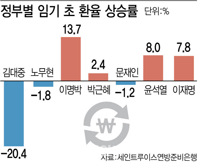 참고로 이재명 정부 임기 초(6월 4일~11월 30일) 환율 변화율은 7.8%다. 전임 윤석열 정부의 6개월 상승률 8.0%와 큰 차이가 없다. 암묵적으로 환율 상승을 유도했다고 알려진 이명박 정부 임기 초(6개월 기준) 환율 상승률은 13.8%였다.