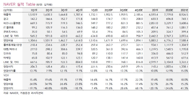 2분기에는 콘텐츠·광고가 실적을 이끌었다는 분석이다. 기존 광고보다 문턱이 낮은 성과형 광고플랫폼(GFA)가 코로나19 영향을 상쇄했고 네이버페이 거래액도 6조원을 돌파하는 등 쇼핑 관련 지표도 높은 성장성을 나타냈다.