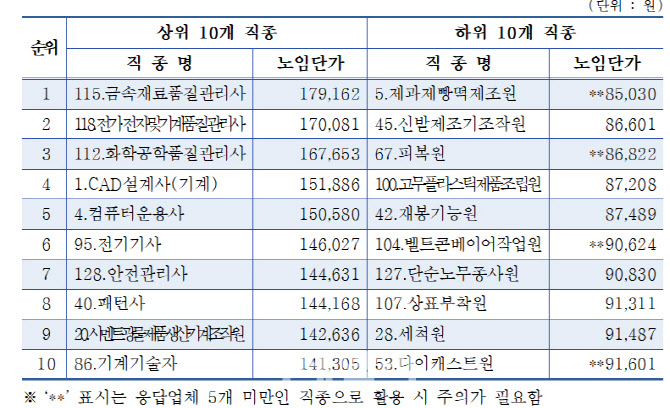 금액 순으로는 금속재료품질관리사의 평균일급이 17만9162원으로 가장 높았고, 전기·전자 및 기계품질관리사가 17만81원으로 뒤를 이었다. 평균일급이 가장 낮은 직종으로는 제과제빵떡 제조원이 8만5030원으로 가장 낮았다.