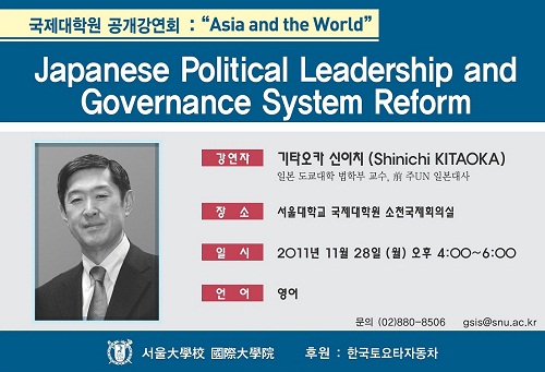 이번 강좌는 現 일본 도쿄대학 법학부 교수 기타오카 신이치(Shinichi Kitaoka)씨를 연사로 초청, 「일본의정치 리더십과 통치구조 개혁」(Japanese Political Leadership and Governance System Reform)이라는 주제의 공개강좌로 진행되며, 참가를 희망하는 사람은 누구나 수강이 가능하다.