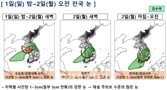 눈은 2일 오전 중 대부분 그치겠으나 이후 날씨는 다시 변동성이 커질 전망이다. 2일 이후 4일까지는 고기압 영향으로 대체로 맑은 날씨가 이어지겠고 6일에는 남쪽 기압골 영향으로 제주도에 비가 내릴 가능성이 있다. 이후 7일부터는 북쪽에서 찬 공기가 내려오면서 다시 추워질 것으로 보인다.