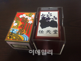 | | 닌텐도가 판매 중인 화투 제품의 사진. 화투패에는 닌텐도를 의미하는 임천당(任天堂)이라는 한자가 찍혀 있다. 사진=유근일기자 |
