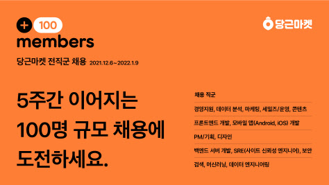 이날부터 12일까지 1주 차에는 △경영지원 △데이터분석 △마케팅 △세일즈·운영 △콘텐츠 직무의 집중 채용이 이루어진다. 이어 2주 차에는 △프론트엔드 △모바일앱(Android, iOS) 개발자, 3주 차에는 △PM(프로덕트 매니저) △디자인 직군 채용이 진행된다. 4주 차에는 △백엔드 서버 개발 △SRE(사이트 신뢰성 엔지니어링) △보안 직군에 집중할 계획이며 5주 차에는 △검색 △머신러닝 △데이터 엔지니어링 직군 서류접수를 마지막으로 +100 members 채용 캠페인이 마무리될 예정이다.