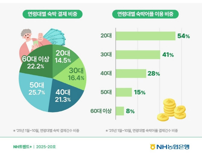 연령별로 살펴보면 액티브 시니어가 여행·숙박 소비를 주도했다. 올해 1월부터 10월까지 연령대별 숙박 결제건수를 살펴보면 50대가 25.7%로 가장 많았고 60대 이상이 22.2%로 뒤를 이었다. 50대와 60대 이상의 결제 비중이 47.9%로 절반에 달했다. 숙박 앱을 통한 결제의 경우 20대의 비중이 54%로 가장 많았다. 30대가 41%, 40대가 28%로 뒤를 이었다. 숙박 앱을 통한 결제에서 50대는 15%, 60대 이상은 8%로 직접 결제 등 다른 통로를 통한 결제가 더 많은 것으로 나타났다.
