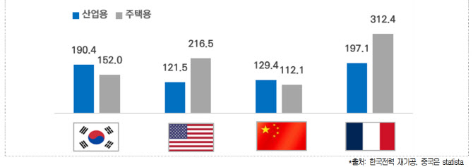 주요국을 살펴보면 산업용 요금은 주택용보다 상대적으로 저렴한 편인데 반해, 우리나라는 산업용 전기요금이 전체 용도별 요금 중에서 가장 높다. 특히, 우리나라 산업용 요금은 미국, 중국보다 높고 발전단가가 낮은 원전비중이 우리(29.9%)보다 2배 더 높은 프랑스(64.2%)와 비슷한 수준이다.