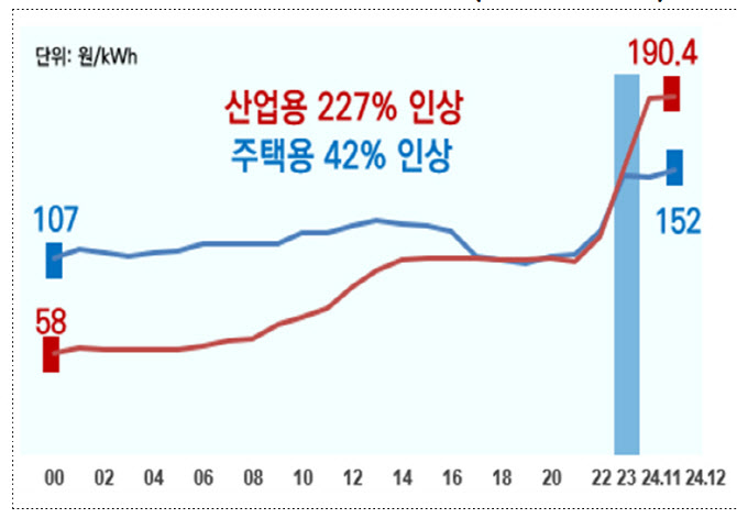 이는 산업용 전기요금의 지속적 인상으로 경우에 따라 자가발전소를 세우거나 전력도매시장에서 전력시장가격(SMP)으로 전기를 구매하는 게 더 저렴한 상황이 됐기 때문인 것으로 풀이된다. 전기요금 인상추이를 보면 2000년 이후 지난해 12월까지 주택용 요금이 42% 오르는 동안 산업용 요금은 227% 인상됐다. 특히 한전은 지난해 10월 24일 산업용 전기요금을 평균 9.7% 인상했다.