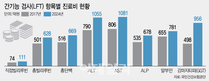 이렇게 감마지피티 검사가 무분별하게 이뤄지면서 건강보험 재정 지출 또한 급증했다. 감마지티피 검사 진료비는 2017년 498억원에서 2024년 956억원으로 8년간 2배 가까이 증가했다. 간 기능 검사 8개 항목 중 가장 증가세가 크다.
