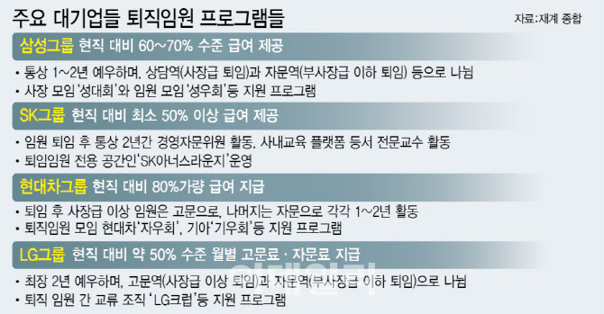 다만 회사는 이들을 그냥 내보내지는 않는다. 임원들은 통상 부장으로 퇴임하는 일반 직원들보다 현직 시절 훨씬 중요하고 민감한 일을 했다. 그런 만큼 기업들은 ‘회사 비밀 유지’ ‘인재 유출 방지’ 등의 목적으로 현직 급여의 절반 이상을 지급하고 다양한 프로그램을 운영한다. 재계 한 고위인사는 “삼성을 비롯한 국내 4대 그룹만 봐도 특히 엔지니어 출신들은 국내외 경쟁사들의 영입 사정권에 있다고 해도 과언이 아니다”며 “이들이 품위를 유지하면서 인생 2막을 설계하도록 하는 것은 회사 입장에서 득이 더 많다”고 전했다.