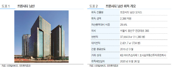 김열매 유진투자증권 연구원은 21일 보고서에서 “앞선 대일빌딩 매입 사례를 고려할 때 향후 신한알파리츠의 유상증자로 자(子)리츠의 트윈시티 남산 매입 자금 중 중순위 차입금 일부 상환하고 보통주식 일부 유상감자로 자(子)리츠 지분율을 최대 100%까지 확대할 것”이라면서 “이번 신규자산 편입을 통한 배당금 확대 정도는 매입 자금 조달 구조가 공개된 후에 정확한 추정이 가능하다”고 내다봤다.